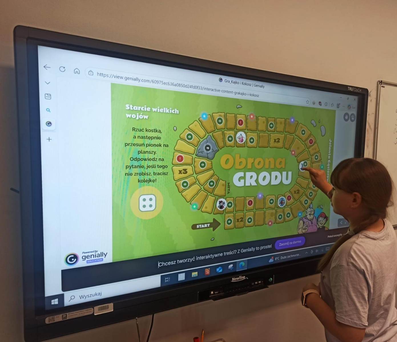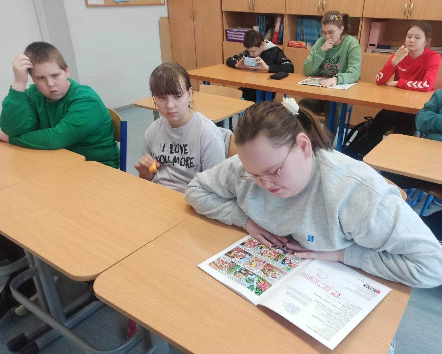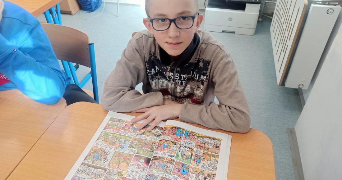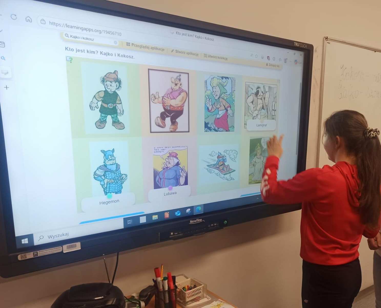 Najpierw uczniowie przypomnieli sobie treść utworu – samodzielnie czytali komiks, a następnie wspierała ich w tym nauczycielka języka polskiego. Po utrwaleniu najważniejszych wątków przystąpili do rozwiązywania zadań na tablicy multimedialnej – testów i quizów. Rozpoznawali oraz charakteryzowali głównych bohaterów (Kajka, Kokosza, Mirmiła, Lubawę, Jagę, Łamignata), opowiadali najważniejsze wydarzenia oraz wskazywali cechy postaci.