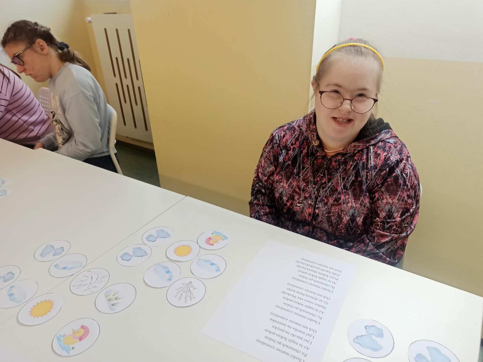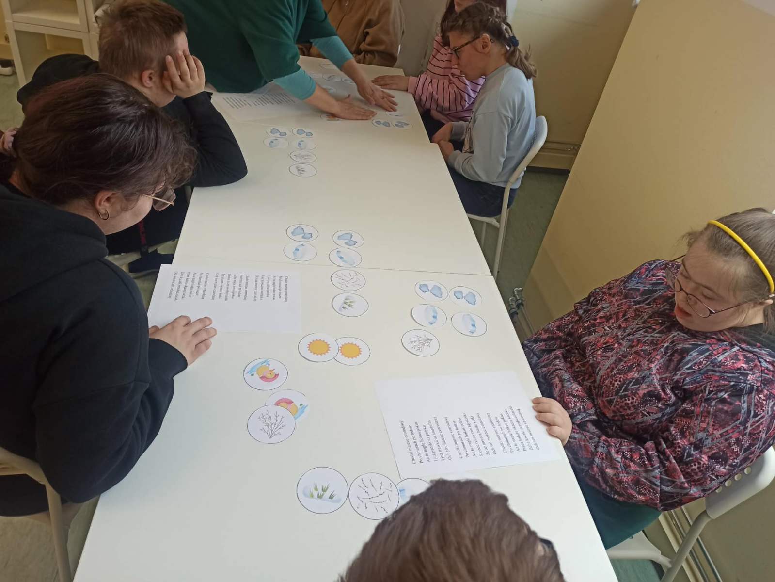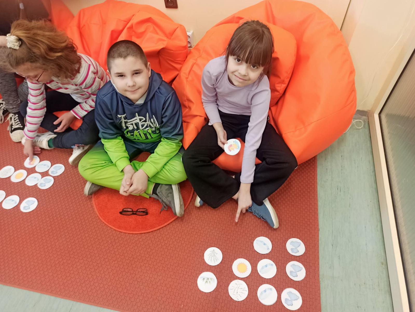 Zajęcia rozpoczęły się rozmową dotyczącą marcowej pogody oraz znaczenia przysłowia „W marcu jak w garncu”. Następnie dzieci wysłuchały wiersza „Marzec czarodziej”, który stał się punktem wyjścia do dalszych aktywności. Po wysłuchaniu utworu uczniowie układali krążki z ilustracjami przedstawiającymi elementy pogody pojawiające się w wierszu, zachowując kolejność zgodną z treścią tekstu. Ćwiczenie to rozwijało umiejętność słuchania ze zrozumieniem oraz pamięć.