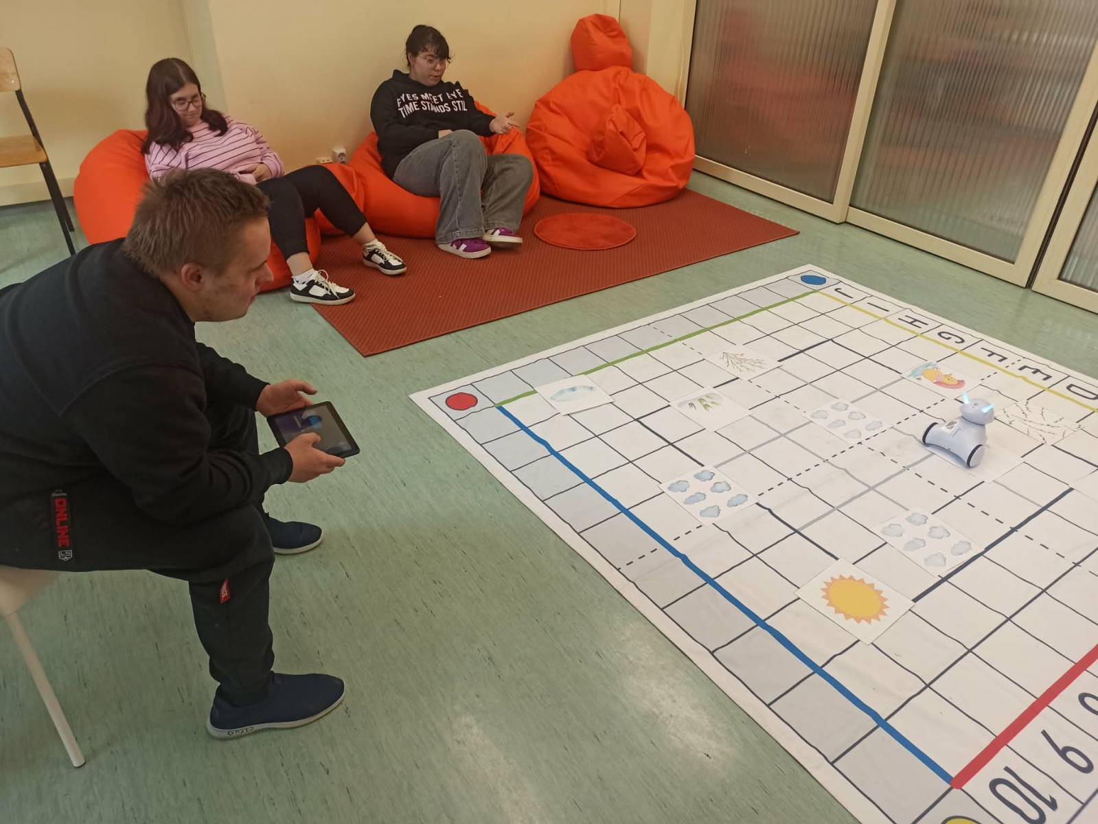 Na zakończenie wydarzenia dzieci pracowały z robotem Photon. Za pomocą tabletu sterowały jego ruchem po macie, na której ułożone były ilustracje z wiersza. Uczniowie planowali trasę robota tak, aby dotarł do wskazanych elementów. Zadanie to miało na celu rozwijanie kompetencji cyfrowych oraz logicznego myślenia.